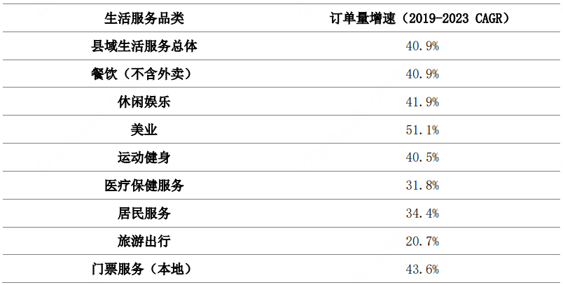 2023年以来,随着消费场景的恢复和消费条件的改善,县域居民的消费潜力得到释放,县域生活服务消费市场总体呈稳中有升态势,在细分品类中餐饮、休闲娱乐、美业、门票服务消费增长显著。美团数据显示2019-2023年前三季度县域生活服务订单量五年复合增长率超40%,在细分品类中餐饮、休闲娱乐、美业、门票服务(本地)等行业的增长率快于生活服务业总体增长情况,运动健身行业增速与总体增长基本持平,医疗保健、居民服务、旅游出行等品类的增速略低于总体情况(见表1)。