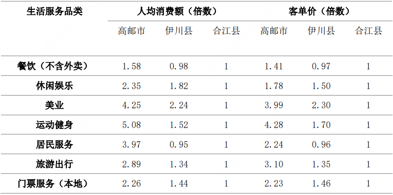 数据来源:2022各县/市/区统计公报、第七次人口普查公报从消费侧看,县域居民生活服务消费额和消费客单价会随着人均GDP的增加而提升。当县域人均GDP向6万元水平发展时,县域居民在美业、休闲娱乐、运动健身和旅游方面的消费开支和消费意愿会显著增加,在餐饮和居民服务方面的消费基本保持不变(见表5)。美团数据显示,2023年前三季度伊川县在美业、休闲娱乐、运动健身、门票服务、旅游出行方面的人均消费额分别是合江县同期水平的2.24倍、1.82倍、1.52倍、1.34倍、1.44倍;客单价分别是合江县同期水平的2.3倍、1.5倍、1.7倍、1.46倍和1.35倍。当县域人均GDP向14万元水平发展时,县域居民各项生活服务消费支出和消费意愿均显著提升。消费支出增长相对较快的分别是运动健身、美业、居民服务和旅游出行消费。美团数据显示,2023年前三季度高邮市在运动健身、居民服务、美业、旅游出行方面的人均消费额比伊川县同期分别高出3.56、3.02、2.01和1.55个标准值;客单价相比伊川县同期分别高出2.58、1.28、1.69和1.75个标准值。