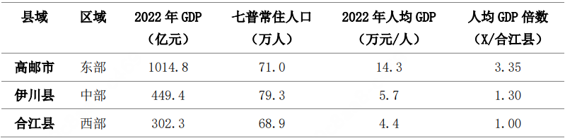 样本地区统计公报和七普数据显示,2022年高邮市、伊川县、合江县GDP分别为1014.8亿元、449.4亿元、302.3亿元;2022年三地常住人口数相近,分别为71万人、79.3万人、68.9万人。按照上述数据进行计算,2022年三地人均GDP分别为14.3万元、5.7万元、4.4万元,以合江县为基数进行对比,高邮市人均GDP是合江县的3.35倍,伊川县人均GDP为是合江县的1.3倍(见表4)。