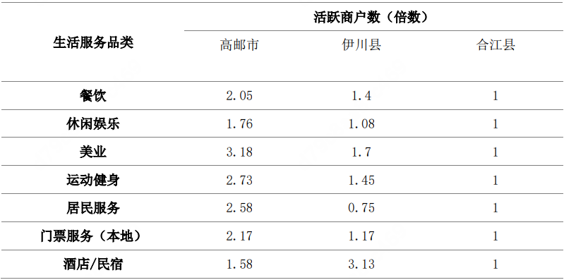 县域间经济发展水平的差异使得不同地区间的生活服务消费水平各异。为了更加细致地了解全国县域生活服务消费情况,本文依据国家统计局的区域划分方法,将全国简化为东部地区、中部地区(包含东北地区)、西部地区,并在各区随机抽取一个县域作为标的县域进行比较分析。最终在东部城市中选取江苏省扬州市高邮市,在中部地区中选取河南省洛阳市伊川县,在西部地区中选取四川省泸州市合江县作为样本地区。