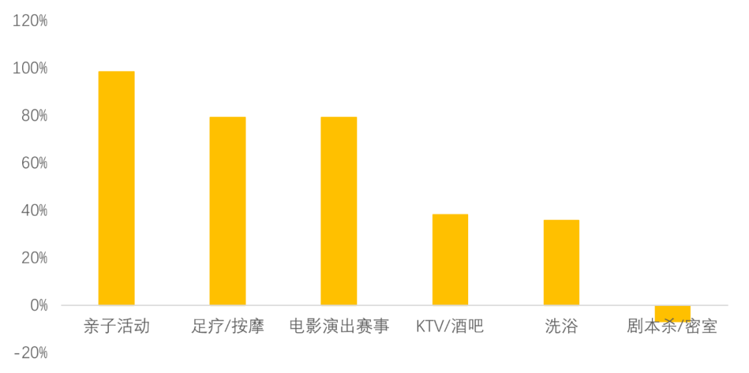 休闲娱乐在县域地区表现出以下特征:一是2023年以来县域消费者通过线上平台进行多业态关联消费的行为明显增多,表现为用户人均休闲娱乐消费类别数量的明显增加和人均消费金额的增加。美团数据显示,2023年前三季度县域消费者休闲娱乐人均消费金额同比2022年同期增加10%。二是细分品类间发展差异较大,陪伴、解乏和文化娱乐是当前县域居民休闲娱乐的主要场景。从各品类增速看,2023年前三季度休闲亲子活动(室内乐园、亲子照、托育服务等)、足疗/按摩、电影演出赛事增速快,同比2022年同期分别增长98.6%、79.4%和79.2%;KTV、酒吧、洗浴品类增速居中,相比2022年同期增加35%左右;剧本娱乐品类出现负增长(见图6),一方面,当前剧本娱乐逐渐向实景剧本娱乐转型,客单价相对偏高,美团数据显示,2023年前三季度县域地区剧本娱乐消费客单价超170元;另一方面,因为剧本娱乐高度依靠剧本内容,经过4-5年的流行,剧本内容和新颖度相对下降。三是文化消费日益多元,非遗消费、民俗文化、艺术消费等新兴文化消费项目呈现较快发展势头。美团数据显示,2023年三季度县域非遗文化、民俗文化相关的本地游客门票订单和异地游客门票订单相比去年同期均有大幅增长。