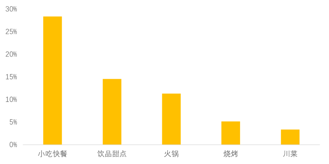 民以食为天,餐饮消费仍然是县域生活服务消费的重要组成部分。伴随着经济与社会的发展,县域居民对餐饮的需求已经从满足基本温饱转向追求更高生活品质转变,在餐饮消费方式上表现为县域居民外出就餐频率的提升。美团数据显示,2023年前三季度县域居民餐饮(不含外卖)消费订单量相比2022年同期增长43%,平台上有交易消费者人数相比2022年同期增加49%,消费者年人均外出就餐频次为13.6次,相较2019年人均外出就餐频次增加1.8次。从品类上看,县域居民外出就餐偏好排名前五的品类分别为小吃快餐、饮品甜品、火锅、烧烤和川菜(见图5)。小众的餐饮品类也开始得到县域居民的青睐,调查问卷结果显示,46%的县域居民外出就餐时更喜欢去小众的或之前没去过的餐厅;美团数据显示,县域地区相对小众的中东菜、非洲菜等品类的订单量2023年前三季度同比2022年同期分别增长116%和295%。