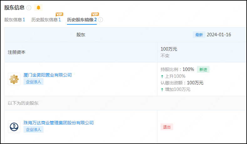 2023年12月25日、26日,大连万达商管分别退出太仓万达广场投资有限公司、湖州万达投资有限公司的股东名单。这两家公司分别新增了苏州联商叁号商业管理有限公司、苏州联商伍号商业管理有限公司为全资股东。