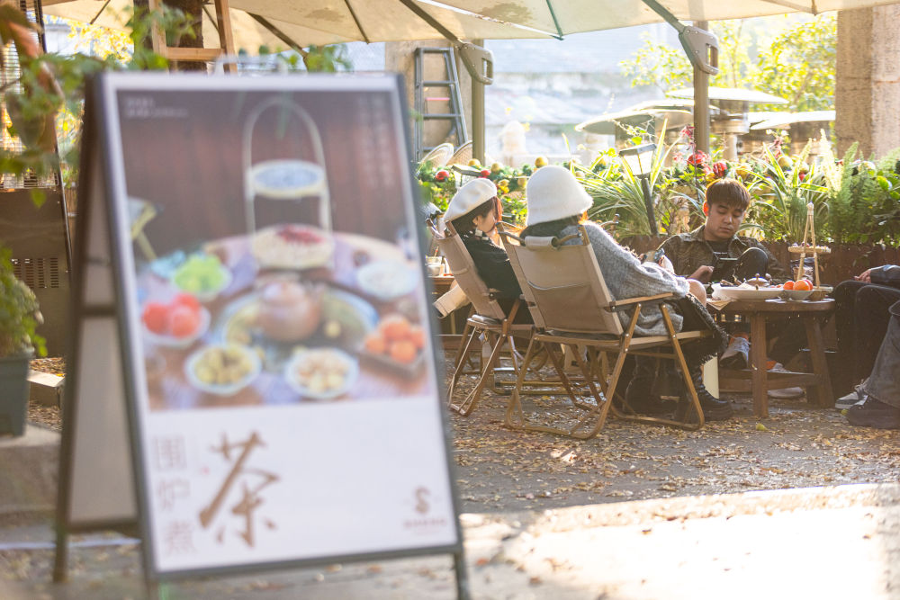 2023年11月25日,在浙江省湖州市吴兴区龙泉街道田盛街,游客在一家饮品店围炉煮茶。新华社发(伊凡 摄)