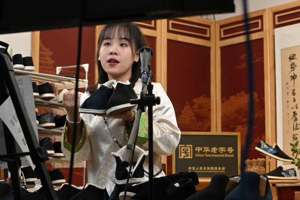 2023年12月8日,主播在老美华的直播基地内带货。老美华始创于1911年,历史上以“千层底”布鞋闻名,是享誉津门的“中华老字号”。新华社记者 李然 摄