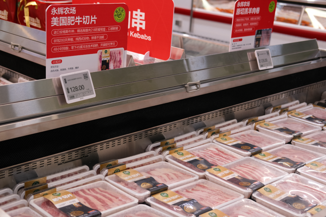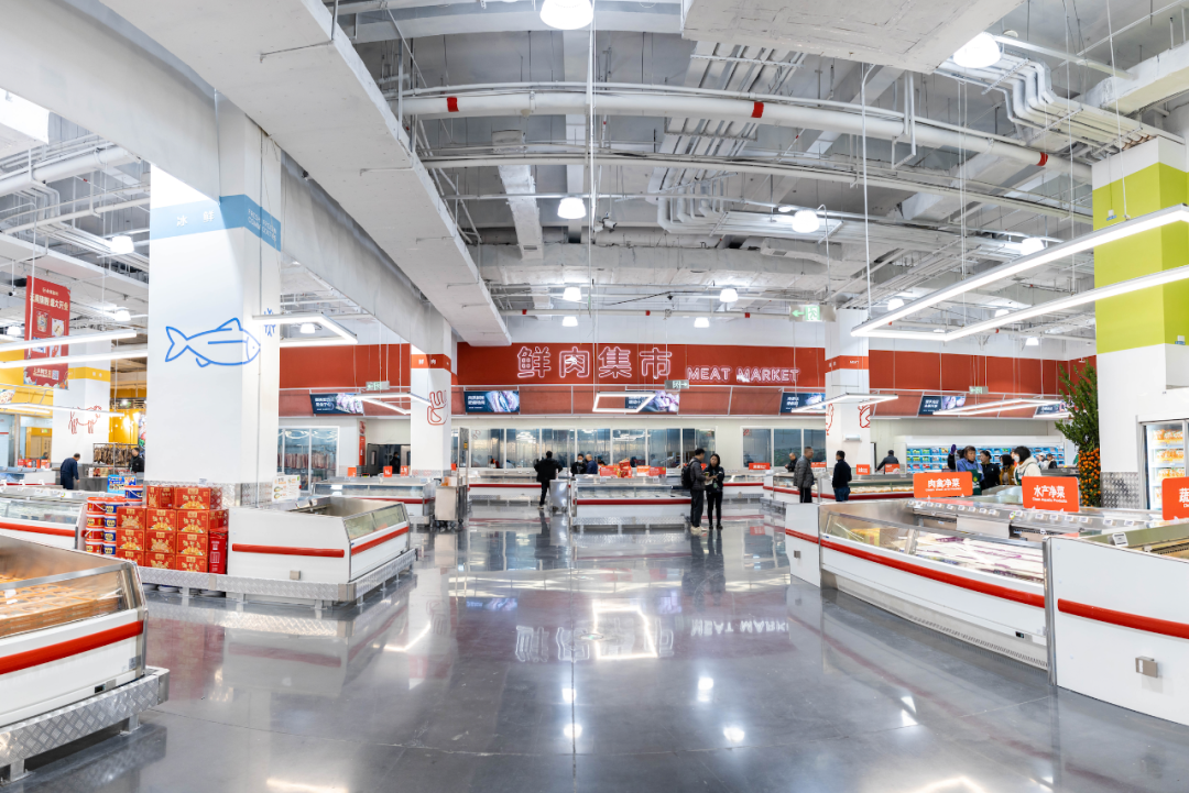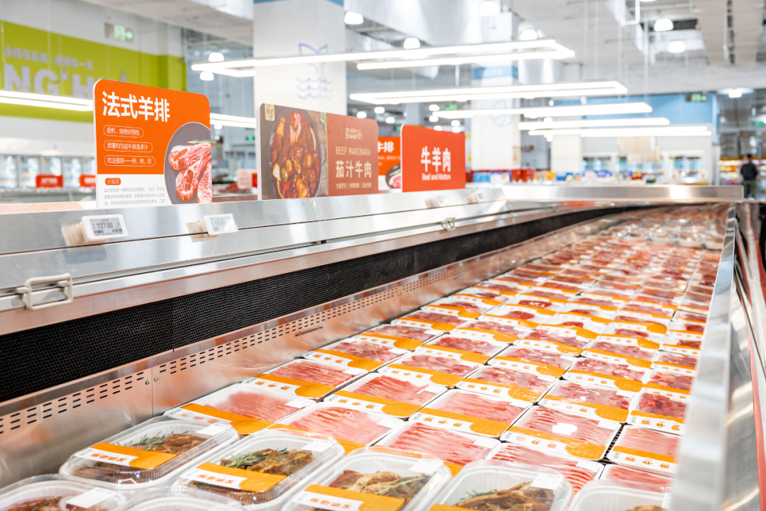 在店内布局上,生鲜区的更新尤为引人注目。新增的开放式低温蔬菜售卖区配备了约100个SKU,并且通过维持10度以下的恒温环境,有效保证了产品的新鲜度。此外,设有独立的鲜肉加工间,现场处理肉品,既保障了食品的新鲜度,又提升了消费者的购物体验。