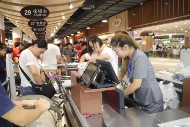 营业面积4800多平方米的大胖店有38个收银台;大胖超市规定,收银台排队人数不能超过3人,超过则加开收银台。