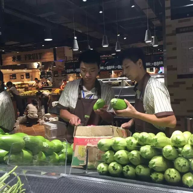 理货员对根茎类的西葫芦等商品进行补货的时候,会用刀把根蒂部位全修剪下去。