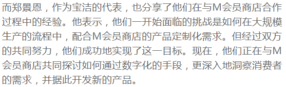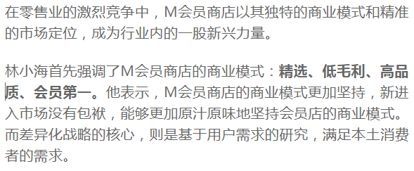 优势四坚持零售本质与差异化:M会员商店团队在进入新赛道时,坚守零售的本质——品质、价格、服务、效率,并在此基础上寻求差异化,打造独特的品牌形象和购物体验。
