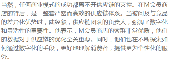 优势二数字化供应链与灵活性:M会员商店强调数字化在供应链管理中的重要性,通过收集和分析客群数据,优化供应链流程,提供更为个性化的服务。同时,保持供应链的灵活性,以适应不断变化的市场需求和产品定制化趋势。