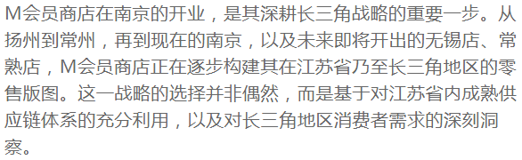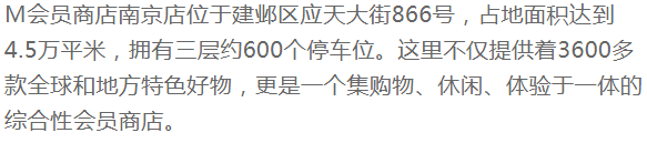 优势一选址策略与资源利用:M会员商店在南京的落地,充分利用了大润发的自有物业资源,确保基础条件如停车位、层高等符合会员店标准。这种策略降低了初期成本,并为商店的顺利运营提供了保障。