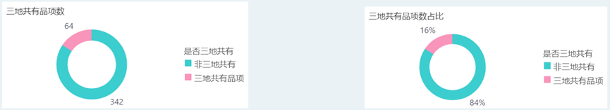 本期三地top200榜单单品共406个单品,其中三地榜单相同单品共64品,占比15.7%。