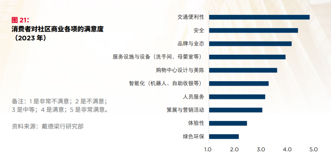 相较于区域级购物中心的“一站式”购物和体验性,社区商业更专注于服务周边几公里范围内的居民,为他们提供日常生活所需的购物环境、社交约会和亲子娱乐场所。根据戴德梁行的调研,现阶段,中国消费者对社区商业的绿色环保、体验性、策展与营销活动,以及人员服务提出了更高的要求。随着中国消费者消费方式和消费习惯的改变,社区商业采用新技术和创新商业模式,从而迎合不断增长的社区消费需求。社区商业通过对租户组合、空间、环境等多方面的优化,提升顾客的消费体验。除了超市、零售、餐饮、生活服务等业态,社区商业还会引入共享办公、儿童、娱乐、诊所、宠物服务等业态,满足消费者的各类消费需求。一些运营成功的社区商业还会打造花园露台、屋顶花园、亲子游乐广场等,作为周边居民的公共活动空间。