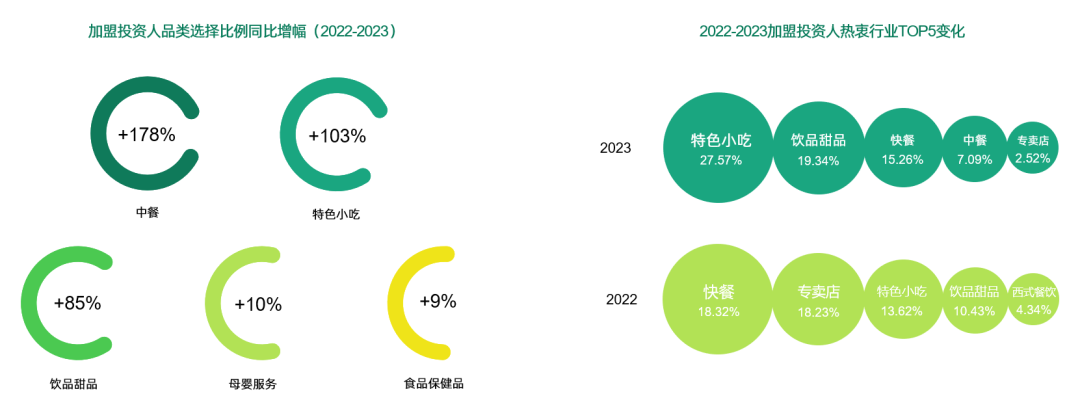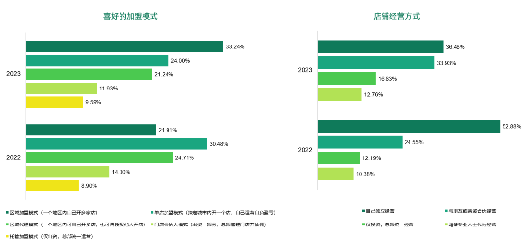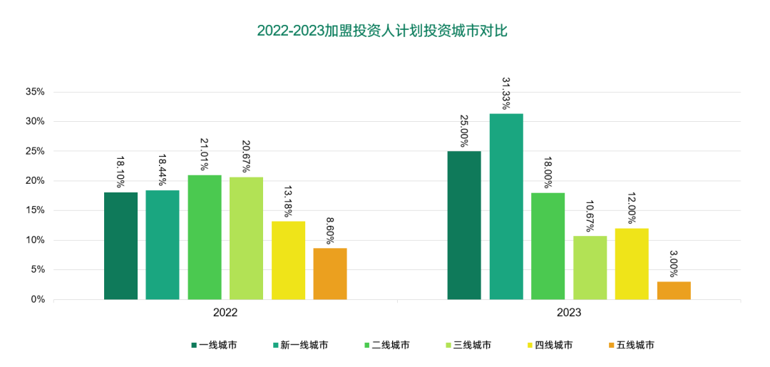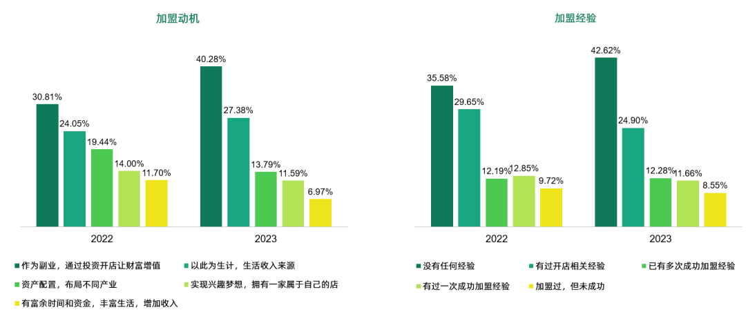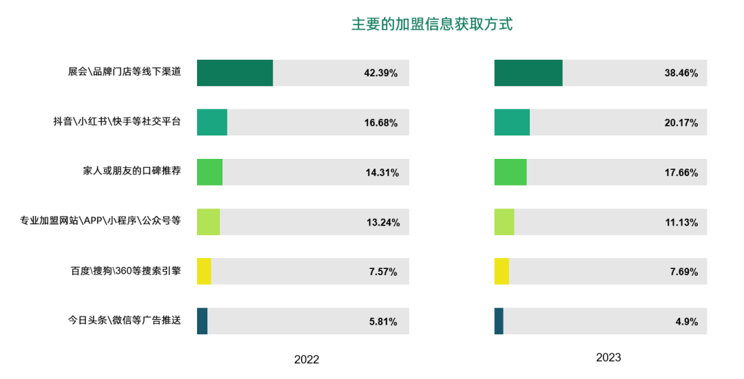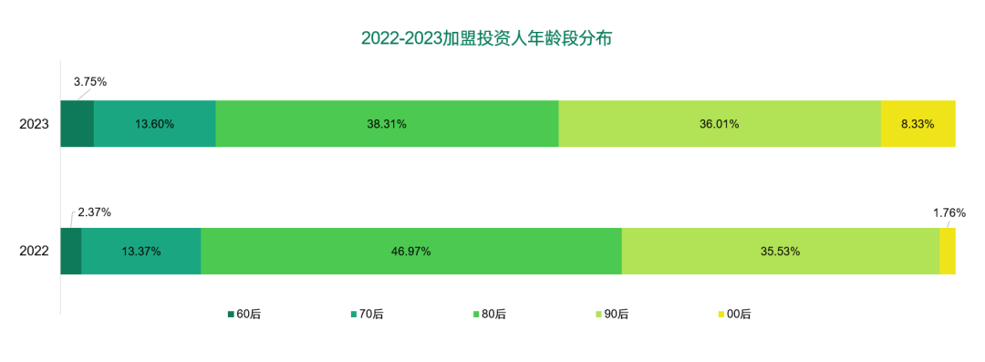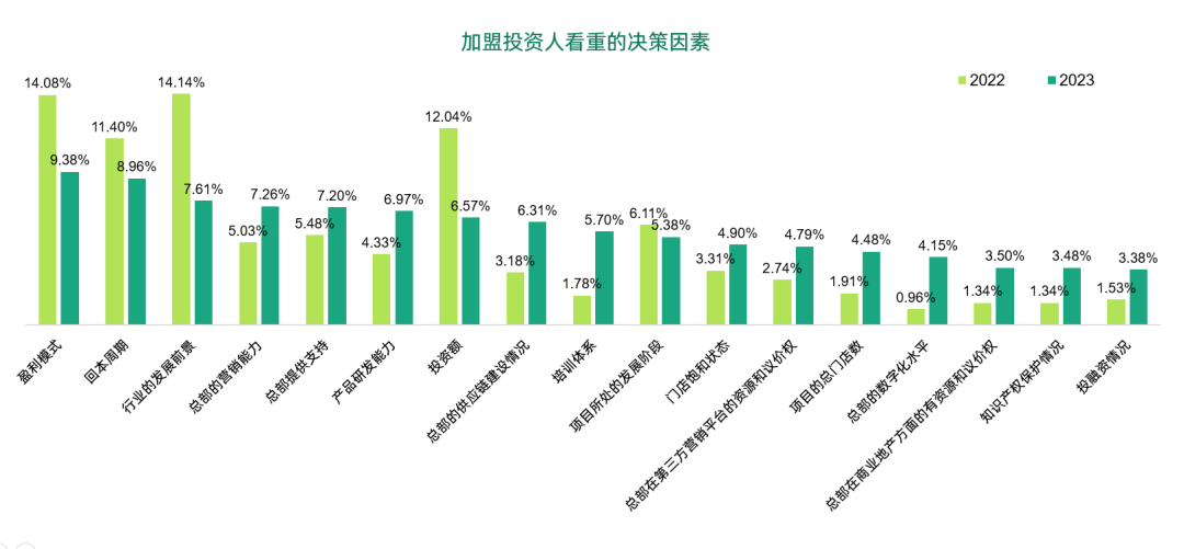 加盟投资群体正在逐渐向Z世代迁移,2023年00后群体占比激增,增长率高达373.68%;虽然80后90后仍是加盟投资主力,但80后所占比重已明显呈下降趋势。从意向投资额来看,20万以下小额投资明显增多,表明在资金投入上,加盟投资人群体的态度趋于谨慎或倾向于更灵活可控的小店型加盟投资策略。从来源看,二三四线城市比重持续增长,加盟投资人群分布趋于均衡发展。从计划投资城市来看,一线城市和新一线城市的投资热度在转暖。餐饮的加盟投资热度明显提升,特色小吃和饮品甜品等小投资额品类热度回暖;母婴服务、食品保健品行业的意向度也有所提升。在2023年,更多人愿意将加盟开店作为副业,来让既有财富增值,但他们大多也缺乏相关加盟\开店经验,也正因为如此,他们才会选择加盟这种成功率更高的模式。虽然小白群体在增多,但有过开店经验或加盟经验的人群仍然占多数。加盟投资人在加盟前考量的因素趋于均衡化,尤为突出的是,总部的产品研发能力、供应链建设情况、培训体系、数字化水平、门店总数受到更多的关注;而盈利模式、行业发展前景、投资额的影响度在减弱,但依然是投资人最看重的决策因素。区域加盟取代单店加盟成为最受投资人喜欢的加盟模式,选择这一模式的加盟投资者达到1/3,倾向托管加盟模式的投资人略有上升。反映到门店经营方式上,倾向于与朋友或亲戚合伙经营,由总部统一经营,或聘请专业人士代为经营的人群均在增长,这与越来越多的人将加盟作为副业的动机相吻合。通过展会\品牌线下门店等看得见、摸得着的方式仍然是加盟投资人最主要的加盟信息获取方式;抖音\小红书\快手等社交平台,以及家人或朋友的口碑推荐影响力在增强。本次报告还发布了不同代际的加盟投资人群特征、高低线城市加盟投资人的行为洞察、各量级投资额加盟人群的特征行为分析、各属性加盟投资人关注品类洞察以及2023年度线上加盟投资人关注热门品牌。