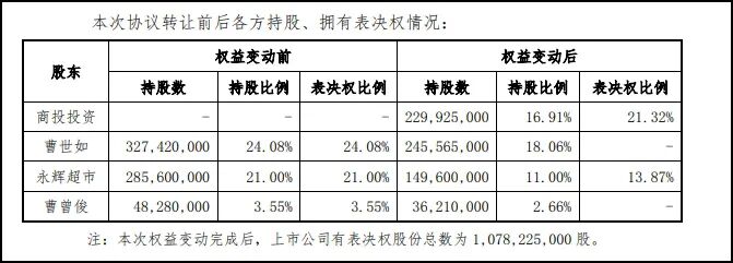本次转让完成后,曹世如持有股份占公司总股本的18.06%。曹曾俊持有股份占公司总股本的2.66%。永辉超市持有公司股份占公司总股本的11%。四川商投投资持有公司股份229,925,000股,占公司总股本的16.91%。