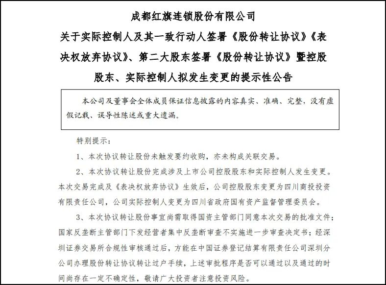备受关注的红旗连锁实控人变更一事,终于尘埃落定了。