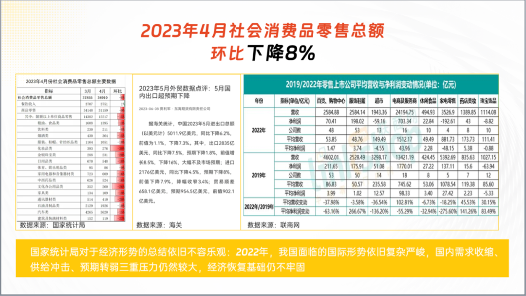 我从业了20年,觉得这两年所有企业的目标只是“活着”,今天大会的主题,叫“活法”,我觉得活法有千万种,而活着只有一个目标。这次,我又一次认真地研读了稻盛和夫的《活法》,12条经营原则,最让我印象深刻的是第10条——我们每个人要不断地从事创造性的创新工作,才是我们“活着”的唯一手段。我今天只讲三点内容,就是我们经济学原理常讲的生产关系、生产资料和生产力。全球格局发生了变化,经济社会发生了变化,我们每个人的工作和生意都会发生巨大的变化。我们要么从中获益,要么从中受损。2023年的4月份,社会消费品零售总额环比下降8%,这个数据不足以代表一切。而在中间我们看到海关数据中出口也降低了接近8%,就意味着生产制造型企业和零售型企业都受到了双重的挤压。从2019年-2022年,零售行业各个渠道都发生了非常多的变化,其中,最惨的是我做了16年的家电零售,平均净利润率,是一个巨大的负数。
