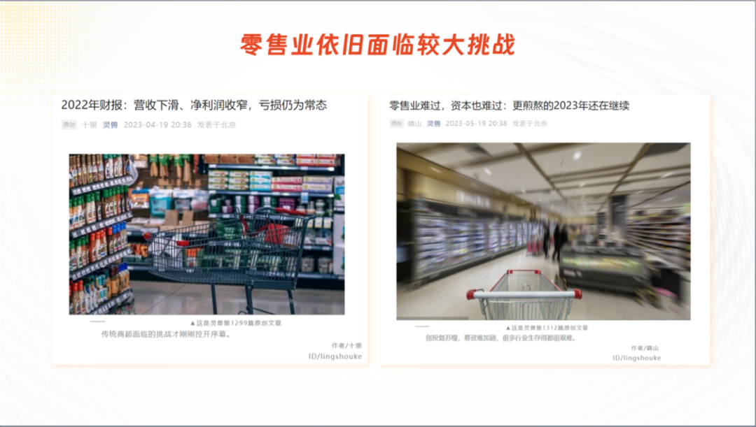 我觉得,在“百年未有之大变局”下,找到“活着”的方法,是我们当下的核心。我们来看看《灵兽》又做了什么?《灵兽》有两篇报道,我放在我的收藏夹里,一篇是《2022年的财报:营收下滑、净利润收窄,亏损成为常态》;另一篇是,《零售业难过,资本也难过:更艰难的2023还在持续》。《灵兽》作为一个行业的见证者和行业分析家,创始人陈岳峰老师带领的团队在告诉我们,寒冬将至、寒冬已至和寒冬将更加的寒冷。