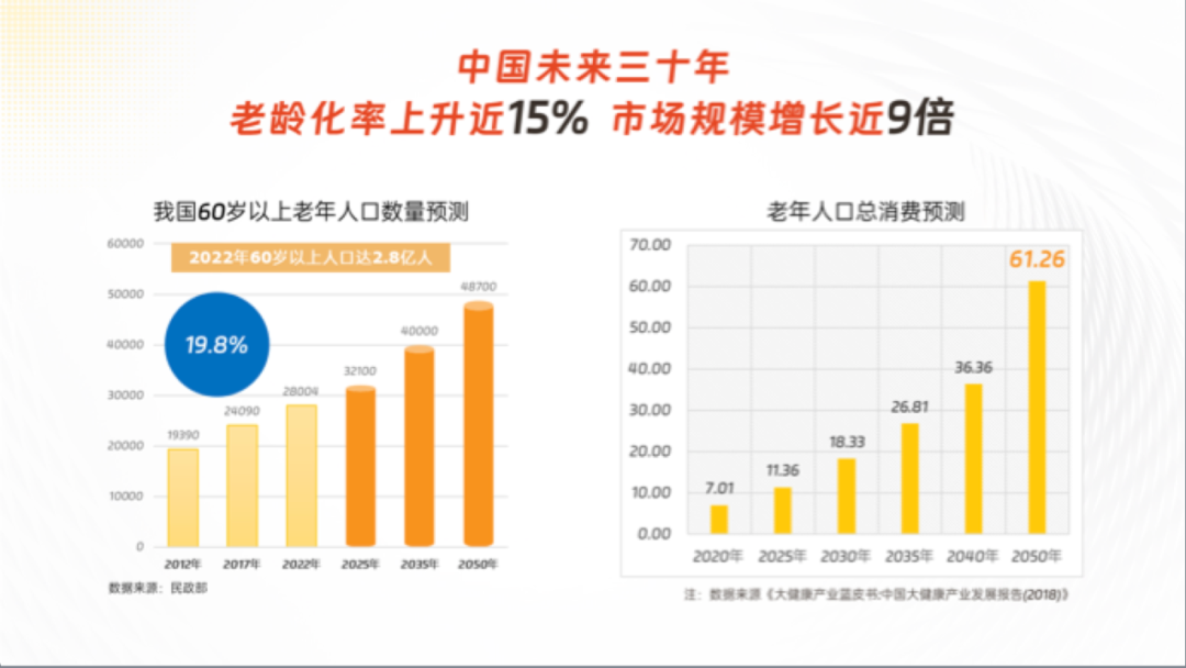 我做了16年的全球零售,做了3年的康养产业,做了1年的产业投资和品牌管理,也担任了中国连锁经营协会的常务理事以及新零售委员会的委员、青年领军者圆桌的班长和“大健康”委员会的副主任委员。当然,我还有一个身份,就是经常活跃在各个零售业的舞台上进行主持,所以我见证和见识了非常多的企业在发生什么,他们有哪些问题。今天濮阳绿城的田总和海纳星地的李总都在现场,我特别尊敬的两位企业家,因为他们不仅认真,而且善学,同时很能干。我做了3年康养,我管的企业是中国最大的居家养老服务公司,服务了2000万老人,所以让我对老龄化有了更深刻的认识。中国连锁经营协会的创始会长郭戈平女士不断地呼吁我们中国零售业的同仁,一定要重视“银发经济”时代的到来。过去30年前的管理者都已经步入了退休的年龄,我们30年前商超的第一代客户也变成了“银发人群”。中国老龄化率的真实数据已经突破了20%,现在已经接近3亿人的规模。 在未来的20年和30年,到2050年,中国老人的数量将会接近5亿规模。人群翻倍,我们又没有匹配的商品、服务来支撑这个庞大的客群,这是需要我们关注的重要一点。同时,市场规模至少会上升9倍。9倍意味着什么?意味着只要你在这个赛道里,你就有可能超越现在所有的生意。我们看看日本发生了什么?日本老龄化率上升了10%,市场规模增长了3.2倍。我为什么一定要把日本的数据放在里面?我们学习老龄化服务是学的日本,我认为,学老龄化的商品、老龄化的综合产品架构体系也要学习日本。