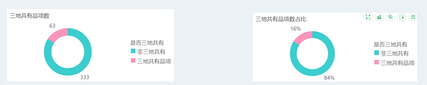 本期三地top200榜单单品共396个单品,其中三地榜单相同单品共63品,占比15.9%。