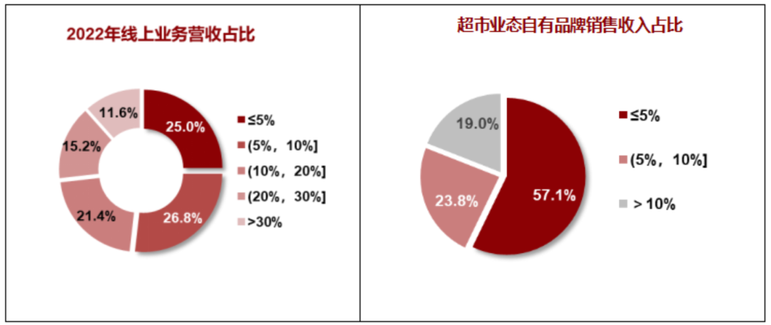 调研企业在创新方面做了不少尝试和努力,如倡导知识与信息共享、设立专门创新团队、组织创新活动、建立针对创新的奖励机制等等。我们看到不同企业线上业务发展的进程具有较大差异:线上业务发展较快的企业其线上营收占比超过20%,但超过半数(52%)企业线上营收占比不足10%;超市和便利店自有品牌销售收入占比低于5%的调研企业近6成。从结果导向来看,线上和自有品牌收入都与行业标杆差距较大,零售企业的创新力普遍不足。在数字化和AI的技术浪潮下,不能创新的企业将会在更加多变的环境和更加激烈的竞争下被淘汰。