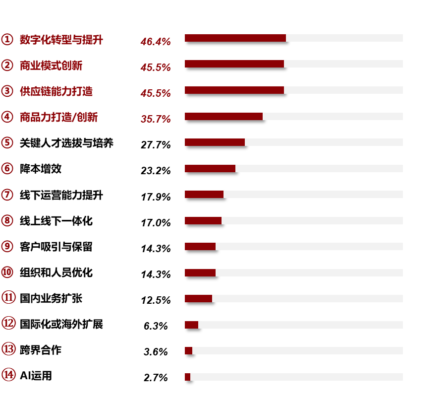零售企业未来关注的三大战略主题依次是:数字化转型与提升、商业模式创新、供应链能力打造。毫无疑问,这些是赢得未来的关键成功因素。