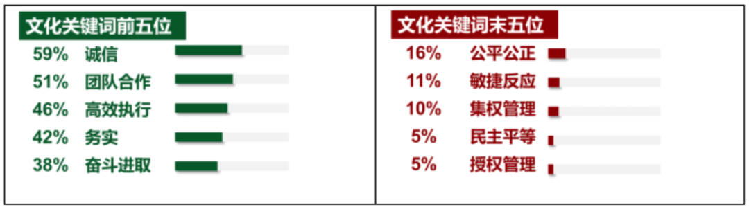 诚信、团队合作、高效执行、务实、奋斗进取是调研企业最普遍认同的文化特征。但是创新需要的文化因素如授权管理、民主平等、敏捷反应、公平公正、开放包容等,在本次调研中是最少被提及的关键词。