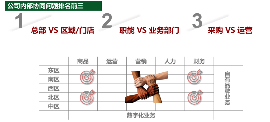 总部和区域/门店的协同、职能和业务部门的协同、采购和运营的协同是前三大协同问题。这几年全渠道、供应链、数字化变革愈发紧迫,传统大型组织都会采用矩阵架构,但当前的变革贯穿多个部门,组织内部的协同是多维的、动态的、复杂的,会出现三维甚至四维的架构,如果再叠加部门墙或诸侯文化,就容易出现官僚主义、形式主义,陷入内耗和混乱。改变这些都需要打通部门间的壁垒,加强上下左右的协同,才能成功。