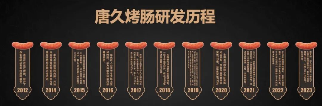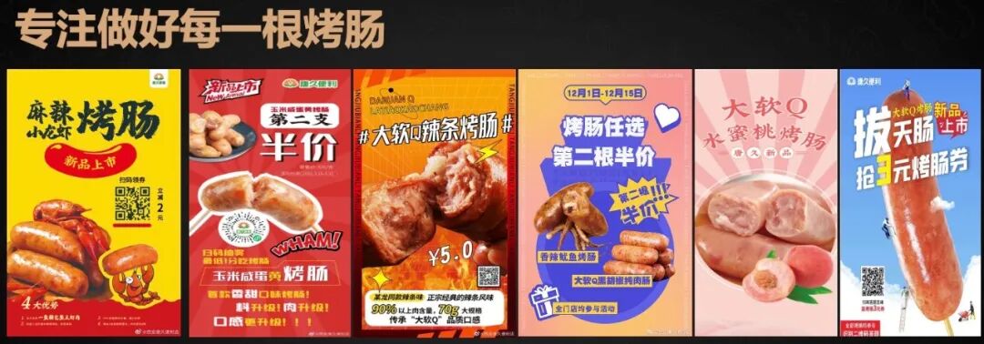 烤肠是便利店销售的重要单品之一,不同于一般便利店直接购买供应商的产品现场加热,唐久的鲜食开发团队将烤肠单品做到极致和卓越。唐久将“让食物充满爱的味道”贯彻到烤肠的开发过程。从2012年引进双汇烤肠之后,联合供应商共同研发,连续11年每年对烤肠进行更新迭代。
