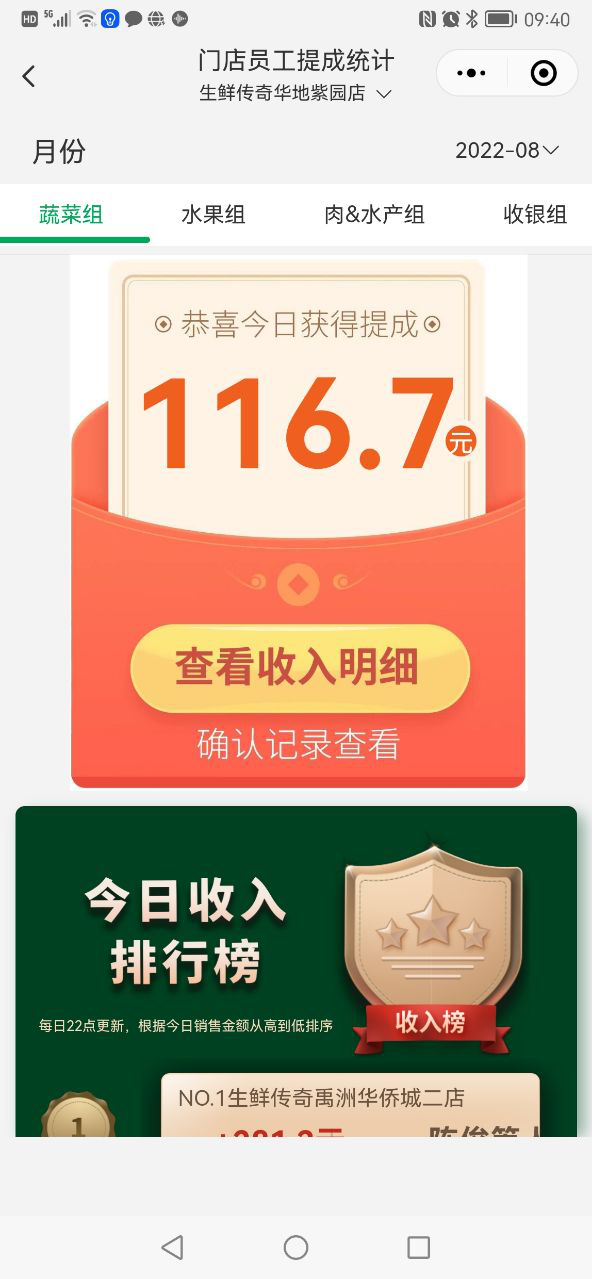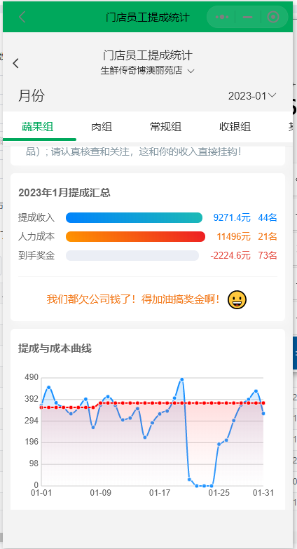 比如蔬果组,门店员工的提成是按照毛利提5%。大家看一下我们自己开发的门店绩效系统。