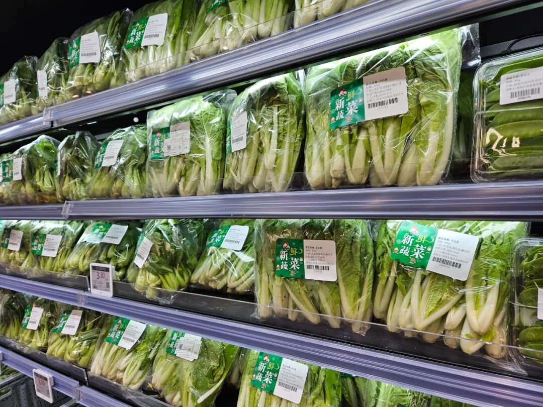一是实现了会员店的生鲜标品化运营。在长申批发超市,龙商网超市周刊发现,蔬菜、水果、鲜肉、烘焙、熟食、冻鲜等,几乎所有的生鲜品类都是精包装、按份售卖,大部分都是以周转筐组成的堆头式陈列、标品化运营,很多生鲜品类的补货、调整都是整个堆头直接调整、置换,在配送、补货、现场管理等方面大大提升了运营效率。比如周转筐陈列的蒜薹、豆角、尖椒、叶菜等品类,每种单品的陈列量都不大,其实这是做到了品质新鲜、高效周转的体现。