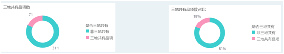 本期三地top200榜单单品共382个单品,其中三地榜单相同单品共72品,占比18.5%。