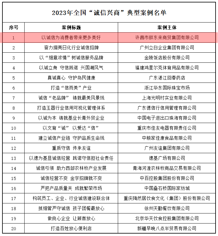 近日,从全国“诚信兴商宣传月”启动仪式上,许昌市胖东来商贸集团有限公司《以诚信为消费者带来更多美好》案例入选全国“诚信兴商”20个典型案例,并位居榜首,是河南省唯一入选的百货零售企业。在2023年河南省“诚信兴商宣传月”活动举办启动仪式上,胖东来商贸集团有限公司介绍了企业七大“诚信之道”。第一、尊重、关爱、成就员工