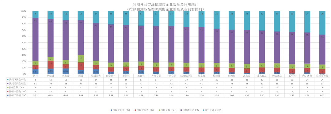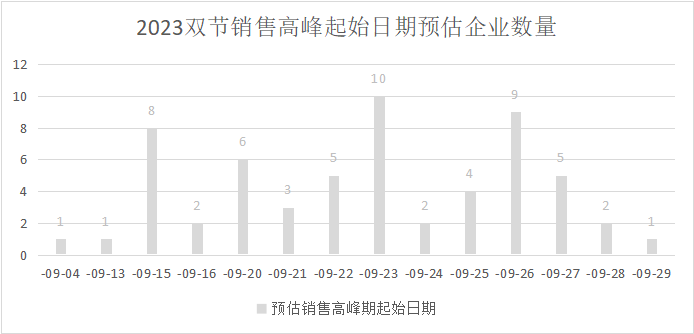 中秋节、国庆节双节临近,中国连锁经营协会采购委对全国59家商超企业,开展了2023年双节(中秋节、国庆节)期间各商品品类的销售数据预测调查。此次调查涉及全国59家商超企业,调查收取的销售数据为区间数据,统计通过中位数、众数与平均值的对比更好的为行业提供对标与参考,具体信息如下:调查显示,2023年中秋节、十一黄金周,假期时长增长,户外出游、走亲访友、宅家休闲将成为节日重点。恰逢双节合一,消费集中度将会提高,超市销售预期整体情况好于去年同期,但对增长幅度预判较为谨慎。从企业预判数据看,饮料、方便食品、休闲食品、纸巾、针织百货等有出行相关商品将具有上升趋势;烘焙类、月饼、水果类、酒类、蛋品、熟食等常规节日属性商品将有所增长;米面粮油、乳品、肉蛋禽、蔬菜等民生商品将保持相对稳定。调查显示,今年双节合一,中秋、国庆两个销售节点合并,统计预估国内销售高峰期出现较为分散,最早9月4开始出现高峰,从9月8日到9月26日全国陆续进入高峰,最晚9月29日出现。从持续时长上看,21家企业认为高峰市场在7天内(占比35%),26家企业认为将持续8-14天(占比44%),12家企业认为将持续15以上(占比20%)。节庆礼品类:双节合一,销售有望集中爆发。节期、节气和民俗消费点燃,聚会和走亲访友回归常态,节日礼品(月饼、水果、保健品)的需求有望上升。婚庆、喜宴等活动可能会在十一期间补办,进一步增加消费。出游类商品:中秋十一连休,出游需求激增,因此旅游类商品的销售可能会增长。方便食品、一次性用品、特产和休闲零食等商品的销售机会增加。出游、自驾、户外、露营、运动场景等相关商品(用品、休闲食品、方便食品及调料)或有看点。民生类:米、面、粮、油、肉、蛋、禽、奶、熟食、蔬菜、调料,中秋和国庆节期间的家庭聚会必备,假期时间长促进购买频次,节日期间保持稳定增长,团购业务助力。调查显示:有47家企业预判稳定或大幅上涨,18家企业认为上涨幅度为5%-10%,认为增长10%-15%的有6家,15%-20%的有4家,认为超过20%的有6家。数据显示预判月饼上涨较稳健,具有较好的预期。但值得注意的是,目前消费者具有更注重健康,环保以及实惠的消费理念,因此高低档商品销售或存在分化,需合理备货。瓶装水、功能饮料、茶饮、果蔬饮料、碳酸饮料、含乳饮料、冲饮、咖啡