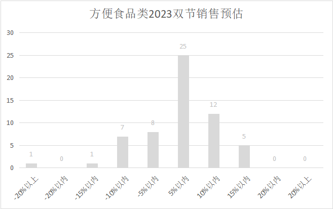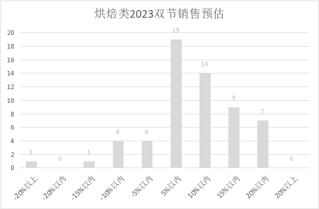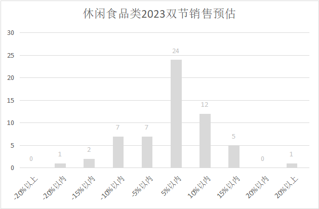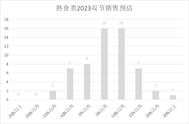调查显示:有44家企业预测销售上涨(占比75%),15家企业预测销售下跌(占比25%),预估销售的中位数与众数都为增长5%,平均值为2.28%。整体预判增长较为稳定,差异主要来源于城市间人口流动及出游行为或带来影响,具体户外烧烤类调料或有增长。调查显示:有43家企业预测销售上涨(占比73%),16家企业预测销售下跌(占比27%),预估销售的中位数与众数都为增长5%,平均值为3.64%。预判趋势较为稳定,但与往年相比,在家时间减少,外出人口流动增加或将对销售产生影响。调查显示:有42家企业预测销售上涨(占比71%),17家企业预测销售下跌(占比29%),预估销售的中位数与众数都为增长5%,平均值为4.58%。中秋和国庆节期间的家庭聚会,熟食同样也是餐桌必备商品,增长幅度预测稳中有升且较为趋同,影响预判减少的原因主要受人口流动,假期出行,餐饮业态回流等因素影响。饼干、曲奇、派类、冲调食品、保健品、方便餐、巧克力、婴儿食品