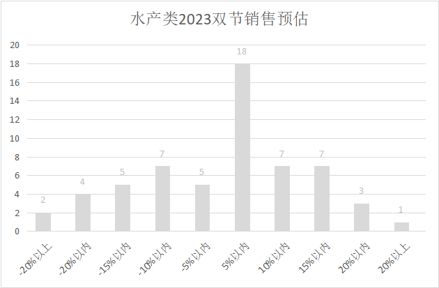 调查显示:有36家企业预测销售上涨(占比61%),23家企业预测销售下跌(占比39%),预估销售的中位数与众数都为增长5%,平均值为2.12%。乳制品具有礼品属性,中秋期间销售有望增长,尤其是与供应商合作紧密的企业预期较好,活动、促销、供应商的支持、大品牌与本土化乳制品的差异有一定影响。鲜活水产、冰鲜水产、称重冷冻水产、联营水产、速冻水产