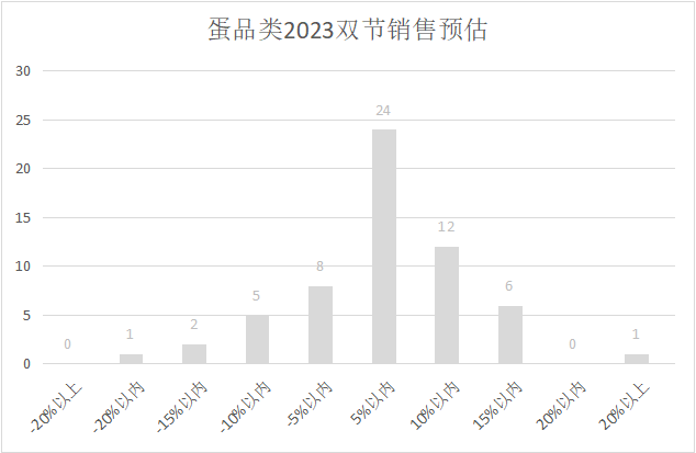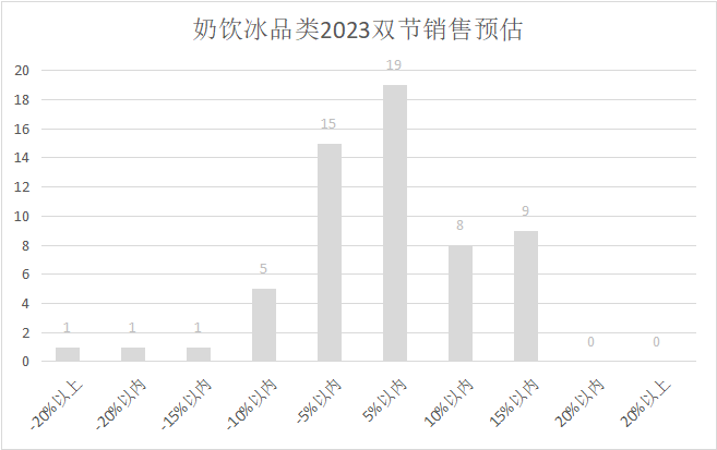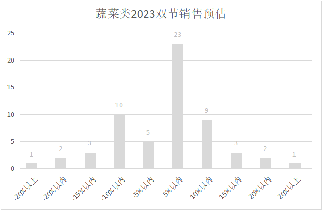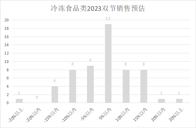 调查显示:有38家企业预测销售上涨(占比64%),21家企业预测销售下跌(占比36%),预估销售的中位数与众数都为增长5%,平均值为1.36%。销售同比预测情况来看,半数以上企业预期销售稳步增长概率高,具备节日效应,但因与往年同比人员流动、外出等原因会造成部分区域预期下跌,对于预期不同地区表现存在具有一定差异。调查显示:有37家企业预测销售上涨(占比63%),22家企业预测销售下跌(占比37%),预估销售的中位数与众数都为增长5%,平均值为2.22%。与往年同比,今年人员流动性大、出游等原因会造成减少往年囤货限行,因此部分企业预期下跌,但也有企业认为,宅家休息或外出露营烧烤也会带动冷冻食品销售增长。与肉类、蔬菜品类一样预期数据存在不同看法。液奶、酸奶、乳酸菌、低温制品、奶酪黄油奶油、冰淇淋