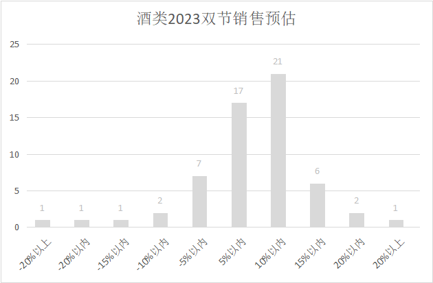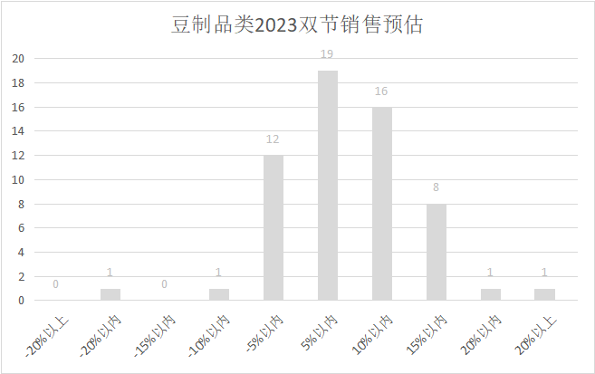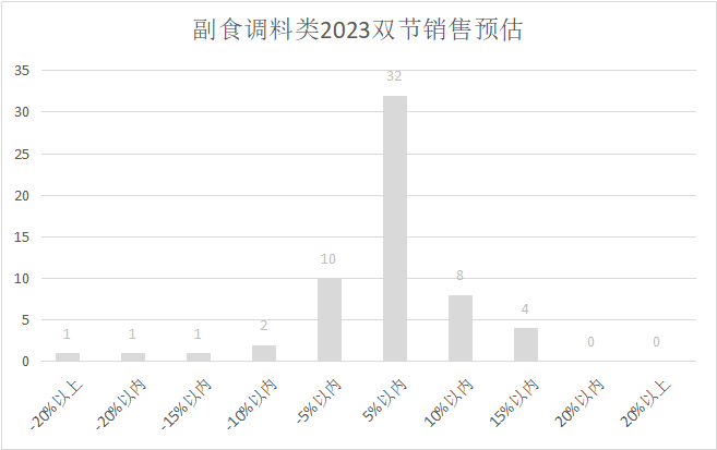 调查显示:有48家企业预测销售上涨(占比81%),11家企业预测销售下跌(占比19%),预估销售的中位数为增长5%,众数为增长5%,平均值为6.89%。节日期间探亲访友的固定消费需求、健康饮食的重视程度增强,应季水果的集中上市以及出行等因素将拉动水果销售,尤其是礼盒装水果或将表现出色,稳中有增的预期较为趋同。调查显示:有47家企业预测销售上涨(占比80%),12家企业预测销售下跌(占比20%),预估销售的中位数与众数都为增长10%,平均值为6.89%。酒水节日属性较强,节假日必不可少,大部分对于5%-10%的增长幅度预期较为坚决,部分企业或将有更高提升空间。但需要注意的是,人口流动(出走、返乡)、高端酒低价酒之间的占比、超长假期带来消费时长或对实际销售产生影响,也有企业反应,受不同购买渠道的酒类价格差异的影响,导致销售预测较为悲观。调查显示:有45家企业预测销售上涨(占比76%),14家企业预测销售下跌(占比23%),预估销售的中位数与众数都为增长5%,平均值为5.59%。豆制品是餐桌必备食材,植物蛋白及健康概念,非节日期间也表现不俗。加之在家休息、假期陪伴的节日属性,增长预期稳定。调味油汁、调味粉晶、酱制品、腐乳、酱、干菜、海味、配料、罐头、蜂蜜果酱