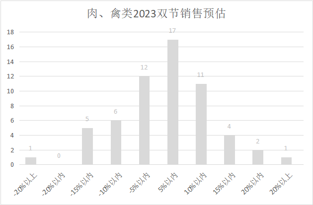 调查显示:有36家企业预测销售上涨(占比61%),23家企业预测销售下跌(占比39%),预估销售的中位数与众数都为增长5%,平均值为0.85%。日本排海舆情导致进口水产消费信心缺失,部分企业对于进口水产持谨慎态度,但舆情过后,包括政策和措施、媒体的报道、以及时间淡化后、消费者的态度和行为等因素,都会对市场产生影响。但此时国产及淡水水产对于销售应有填补和推动作用,大闸蟹等节气商品也会有拉动销售,企业观点不一。猪、牛、羊、禽、其他肉类,调理肉类半成品0-4度、速冻禽类、速冻肉类
