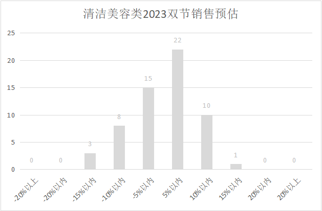 调查显示:有35家企业预测销售上涨(占比59%),24家企业预测销售下跌(占比41%),预估销售的中位数与众数都为增长5%,平均值为1.69%。肉类预期存在一定分歧,主要成因包括市场价格波动,与往年相比囤货现象减少,出行及餐饮业态回流影响。但也有企业认为,中秋十一时间超长,只想在家休息以及老年人等不宜走动或外出的人群,返乡在家人群或对销售有积极作用。但截止发稿前,猪肉价格所有所回升,实际有望好于预期。调查显示:有33家企业预测销售上涨(占比55%),26家企业预测销售下跌(占比45%),预估销售的中位数与众数都为增长5%,平均值为0.32%。此类商品节日效应较低。但美容类如防晒、保湿、驱蚊等功能性商品,针对性顾客出游场景引导应该存在机会。