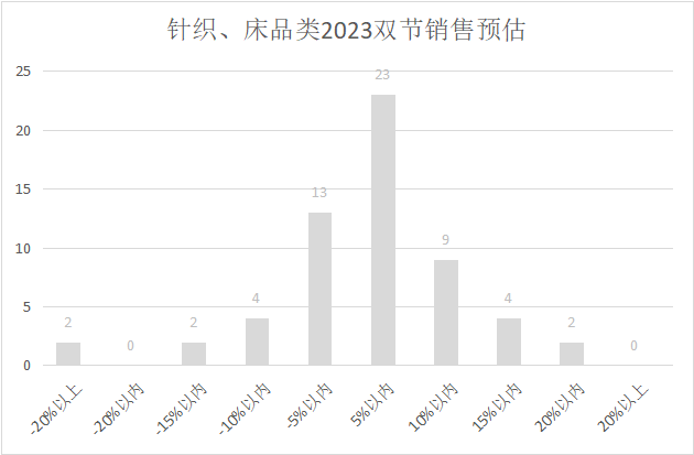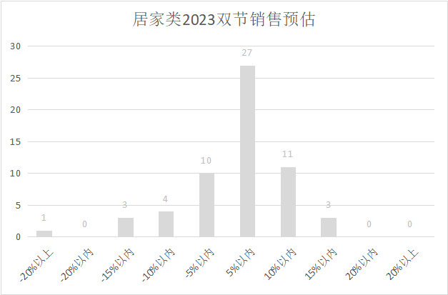 调查显示:有41家企业预测销售上涨(占比69%),18家企业预测销售下跌(占比31%),预估销售的中位数与众数都为增长5%,平均值为2.2%。居家类商品对比或将出现分化。预估较好的企业认为假期出游对于一次性用品、户外装备等品类有带动效应,但也正因为本地人外出旅游,导致居家相关卫浴日杂等商品消费会减少。调查显示:有39家企业预测销售上涨(占比66%),20家企业预测销售下跌(占比34%),预估销售的中位数与众数都为增长5%,平均值为2.54%。预测情况来看,半数企业预期销售增长幅度较稳定。节日送礼可能拉动部分增长,但不及春节假期。预判减少的原因主要与去年相比人口流动,购买频次减少,假期出行,餐饮业态回流等因素影响。此外也与团购业务的优劣有直接关系。保暖内衣、睡衣睡裤、袜类、拖鞋、毛巾、床上用品、休闲鞋及服装、婴儿用品