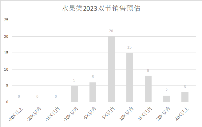 调查显示:有49家企业预测销售上涨(占比83%),10家企业预测销售下跌(占比17%),预估销售的中位数为增长5%,众数为增长10%,平均值6.59%。整体预判销售额稳健增长,部分超市的销售增长显著,成功的销售策略,如促销活动、市场定位或产品创新对销售存在影响。烘焙食品(包含现制类)新鲜,口感好且具有一定保质期,中短途出行可方便携带方便,可休闲或应急果腹。此外,节庆民俗消费如蛋糕、糕点等可能会在节日期间受到一定的销售推动。苹果、梨、桃李杏、柑橘、瓜果、浆果、热带类、坚果类、其他水果、水果礼盒