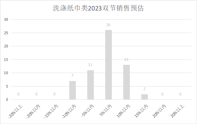调查显示:有41家企业预测销售上涨(占比69%),18家企业预测销售下跌(占比31%),预估销售的中位数与众数都为增长5%,平均值为2.8%。线上渠道或对居家洗衣类商品一直存在影响,但双节无论在家休息还是旅游出行,纸品、家清均有上升趋势,增长预判较为趋同。厨房用品、餐具、水具、一次性用品、清洁收纳用品、卫浴日杂用品、宠物用品、汽车用品、文体用品、箱包用品、玩具、五金电料、季节性用品