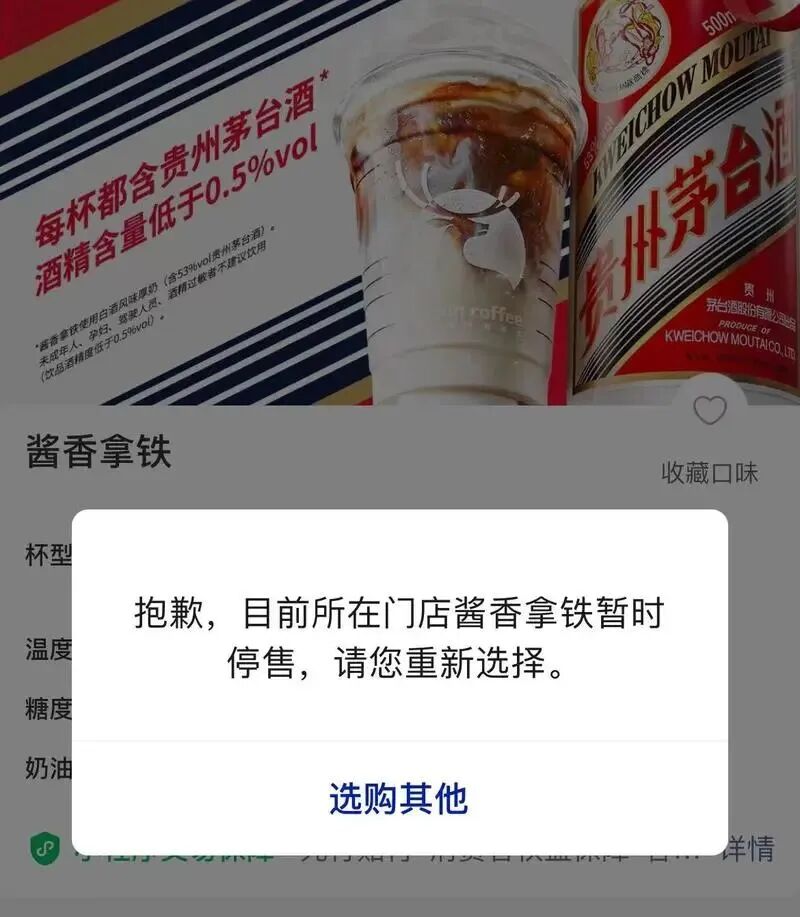 根据瑞幸咖啡小程序显示,目前“酱香拿铁”已上架,售价为38元/杯。使用优惠券后,预计只需要19元/杯。值得注意的是,这款咖啡使用的是白酒风味厚奶,含53度贵州茅台酒,酒精度低于0.5%。