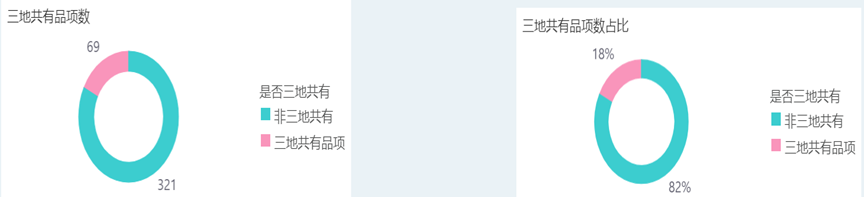 本期三地top200榜单单品共390个单品,其中三地榜单相同单品共72品,占比17.5%。