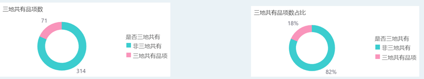 本期三地top200榜单单品共385个单品,其中三地榜单相同单品共71品,占比18.4%。