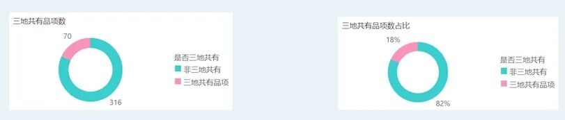 本期三地top200榜单单品共386个单品,其中三地榜单相同单品共70品,占比18.1%。