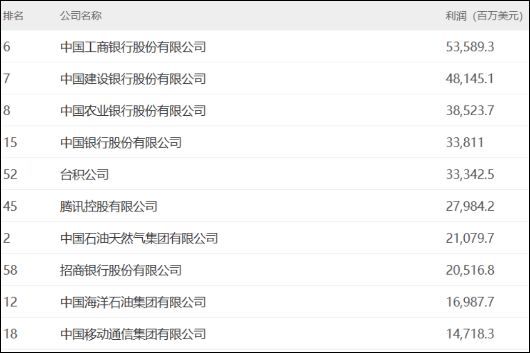 在盈利能力方面,最赚钱的10家上榜公司中,除五家商业银行和中石油、中海油、中移动之外,两家私营企业也进入了前十位,其中台积公司以333亿美元净利润排在利润榜第5位,腾讯的净利润比去年下降了19%,但仍以超过279亿美元的净利润排在利润榜第6位。