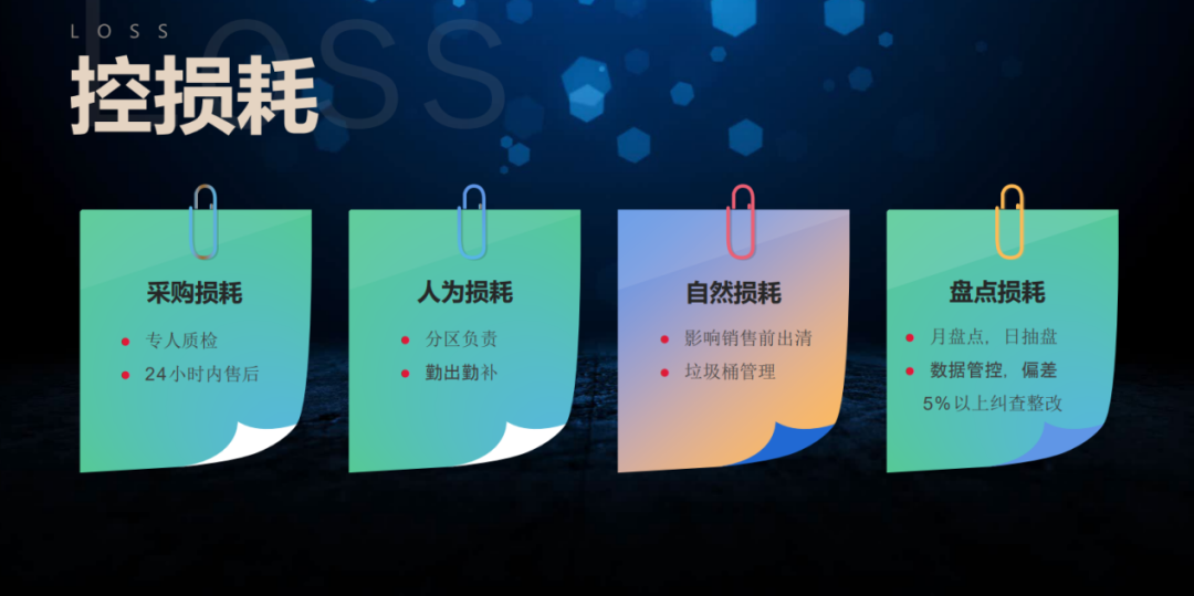 控损耗我们从四个方面着手,分别是采购损耗、人为损耗、自然损耗和盘点损耗。采购环节就把控好,分区域、分货柜安排负责人,减少盘点损耗,最后,卖不完我们就送给老百姓。