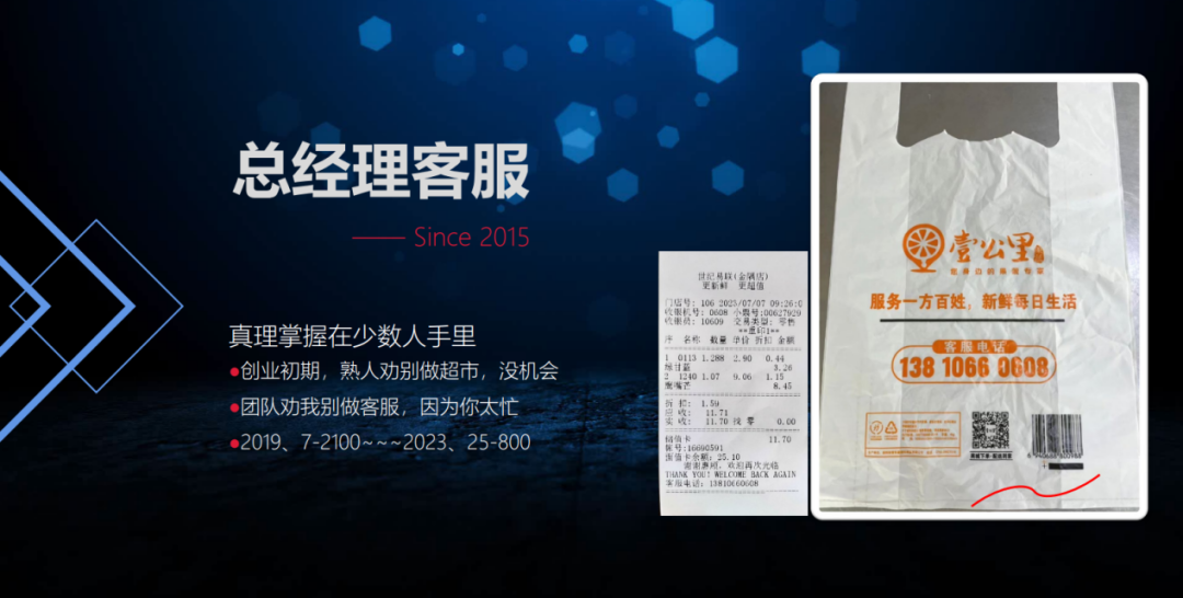 从2015年创业到今天,壹公里所有的小票包括购物袋的客服电话都是我的手机,老板就是客服,我坚持了7年。